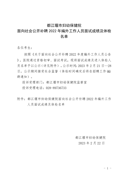 都江堰市妇幼保健院面向社会公开补聘2022年编外工作人员面试成绩及体检名单