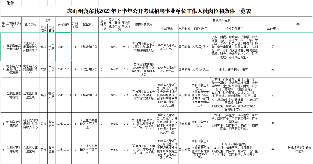 附件:凉山州会东县2023年上半年公开考试招聘事业单位工作人员岗位和条件一览表