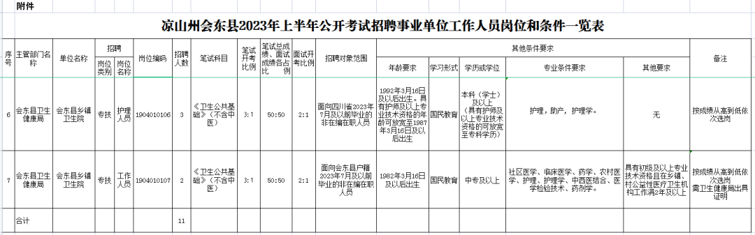 本次招聘岗位7个,招聘人员11名,具体岗位见附件《凉山州会东县2023年上半年公开考试招聘事业单位工作人员岗位和条件一览表》(以下简称《一览表》)。
