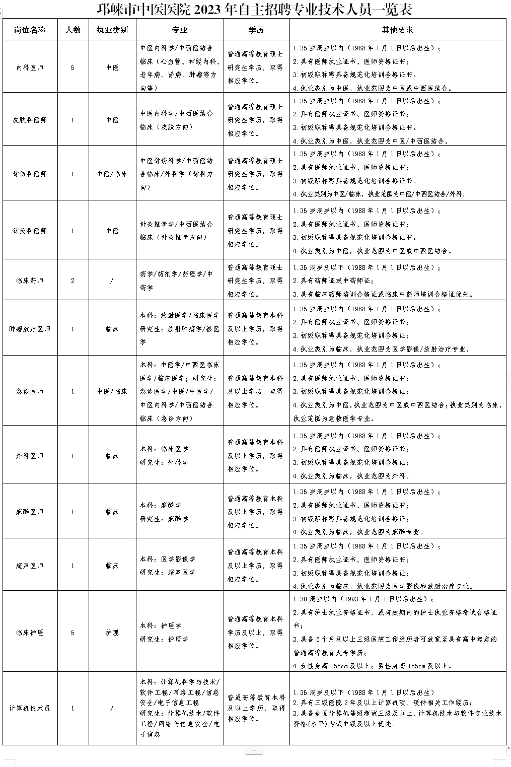 详见《邛崃市中医医院关于2023年自主招聘专业技术人员的实施方案》。