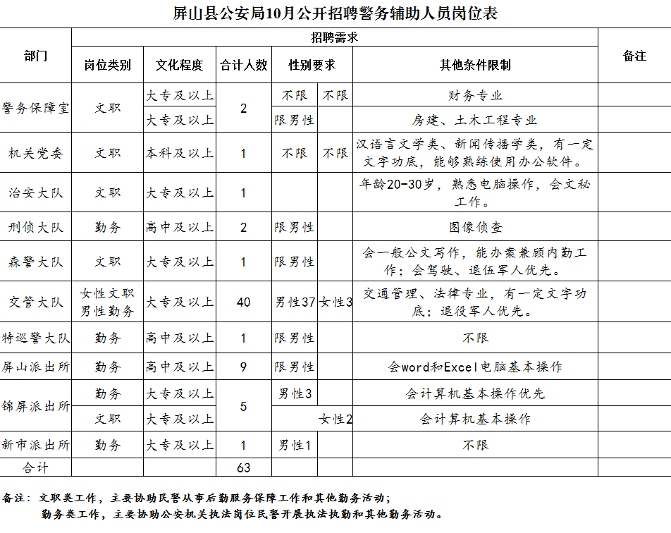 本次招聘警务辅助人员63名。具体招聘岗位详见《屏山县公安局公开招聘警务辅助人员岗位表》。