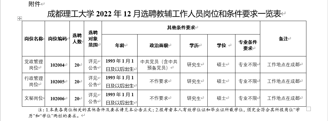 面向全国选聘2023年7月31日前取得普通高等教育研究生学历和硕士学位,并完全符合《成都理工大学2022年12月选聘教辅工作人员岗位和条件要求一览表》(附件,含表注,以下简称《岗位和条件要求一览表》)相关岗位条件要求和本公告其他要求的人员。其中,2023年高校应届毕业生必须在2023年7月31日前取得符合岗位条件要求的毕业证等证书,并凭证书办理确认等手续;其他报考者必须在面试资格审查前取得符合岗位条件要求的国家承认学历的毕业证、学位证等证书。未在规定时间内取得并提供有关证书的,视为报考者自动放弃,责任自负。2023年8月1日之后毕业的在读生不属于此次选聘的范围。