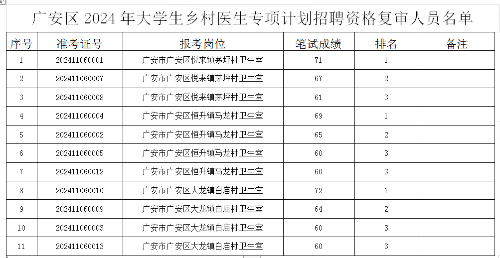 根据《关于广安区2024年大学生乡村医生专项计划招聘的公告》精神,现将广安区2024年大学生乡村医生专项计划招聘资格复审和面试有关事宜的公告如下: