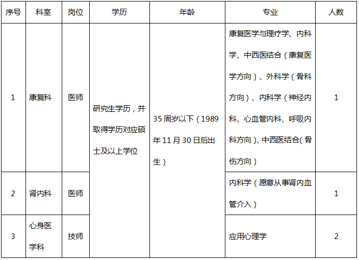 根据医院工作需要,经研究决定,面向社会招聘康复医师、肾内科医师和心身医学科技师,现有关事项公告如下:
