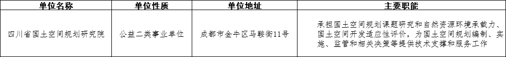 根据《四川省省属事业单位公开招聘工作人员实施细则(试行)》(川人发〔2006〕34号)有关规定,四川省国土空间规划研究院现将考核招聘有关事项公告如下(本公告由四川省国土空间规划研究院同时在四川省人力资源和社会保障厅“人事考试”专栏和四川省自然资源厅官网上发布,下同)。
