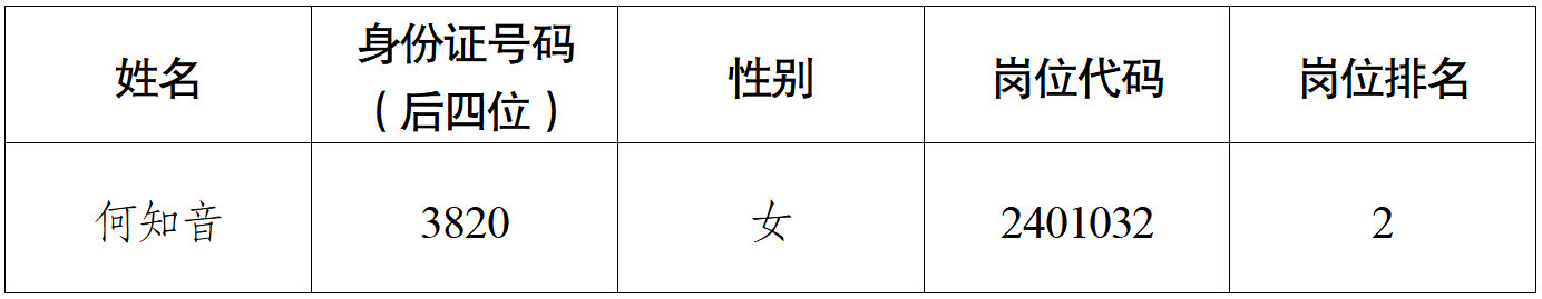 因岗位编码2401032体检对象向梁洪未在规定时间报到参加体检,视为放弃体检资格。按照《公告》要求,现将该岗位递补体检对象公告如下: