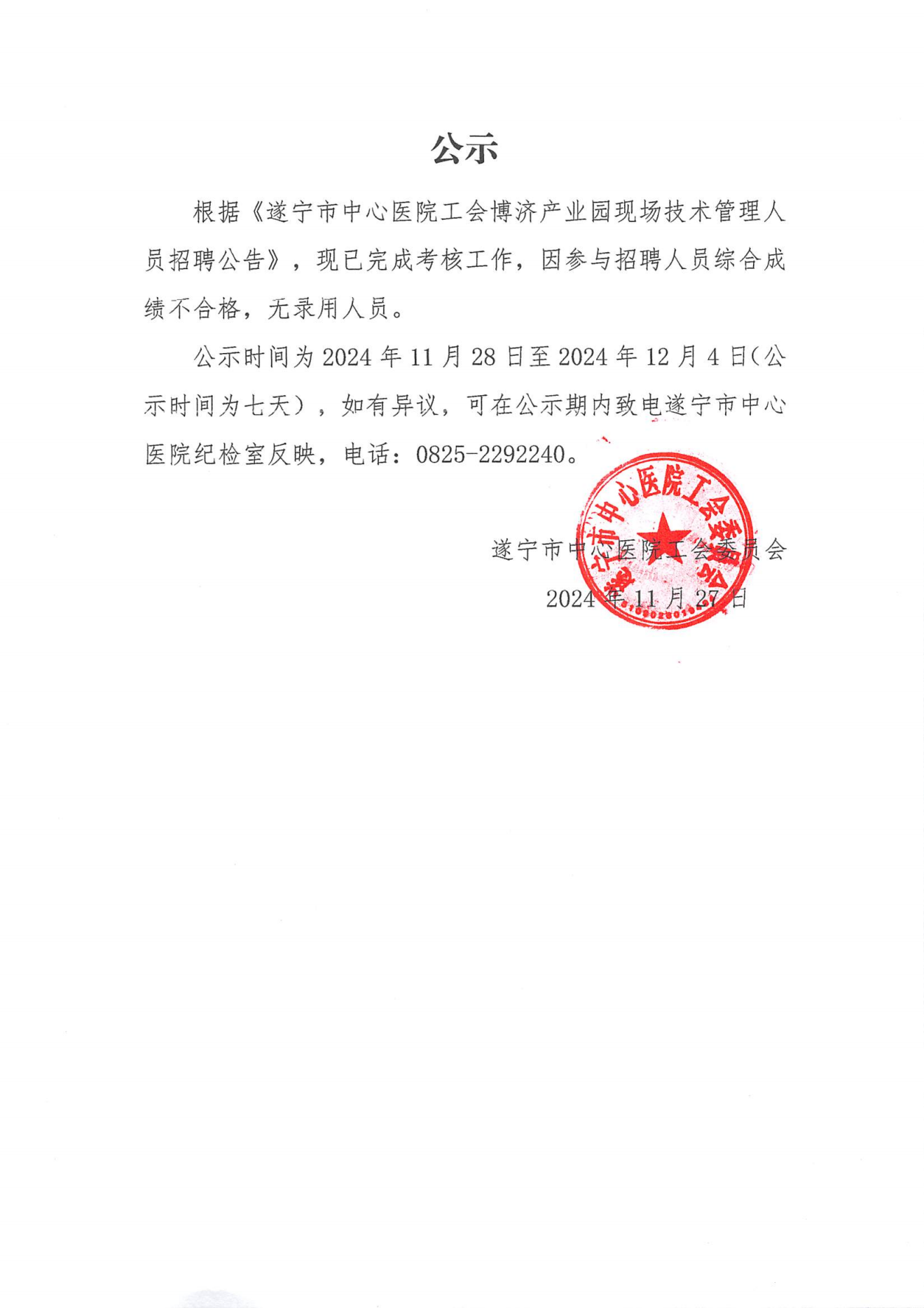 关于遂宁市中心医院工会博济产业园现场技术管理人员招聘结果的公示