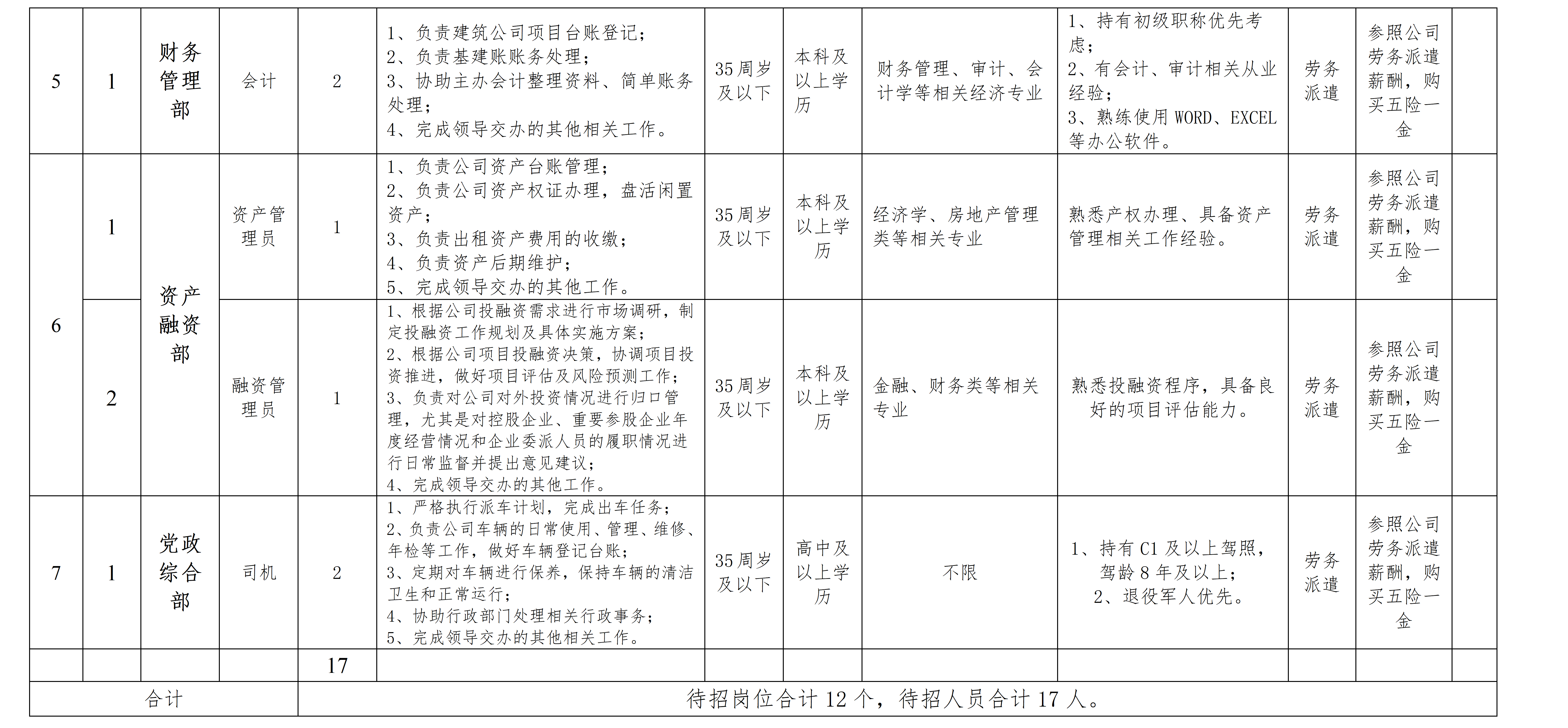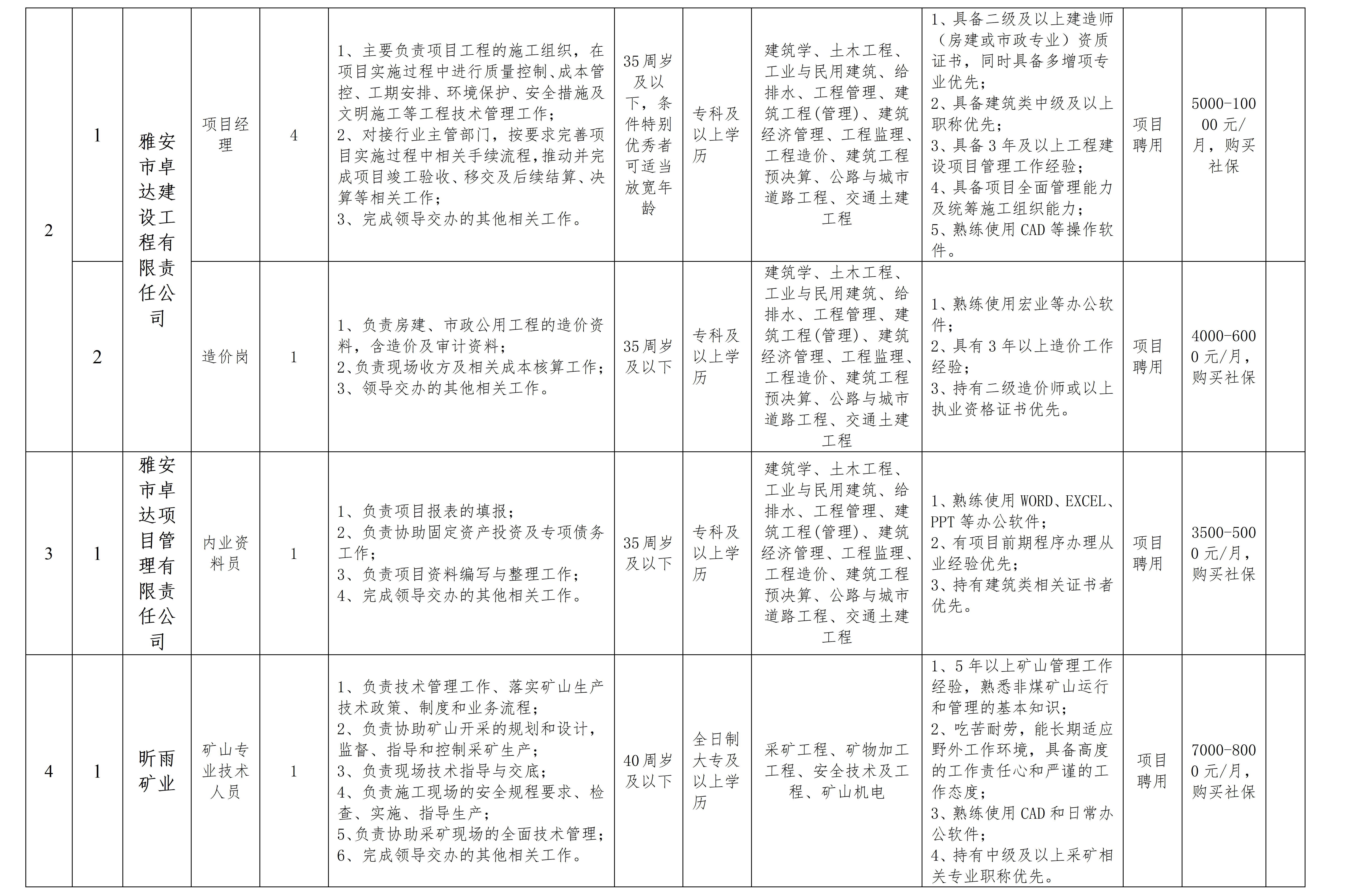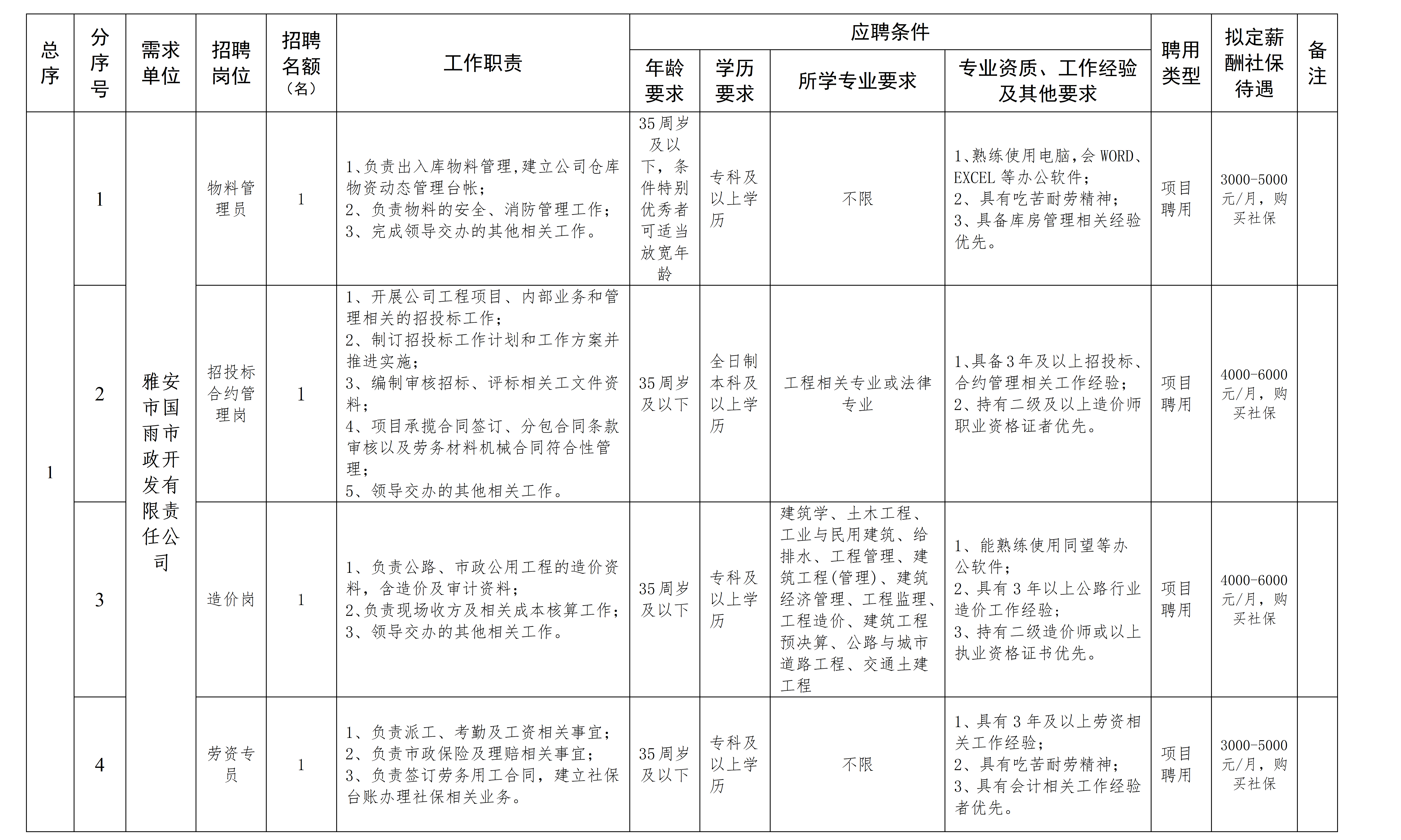 雅安市雨城实业发展有限责任公司(下称:雨发展)是经雅安市雨城区人民政府批准,于2002年成立的国有独资有限责任公司。经营范围为在政府授权范围内对能源、交通、土地、矿产、城市、林业、涉水资源等领域进行投融资和经营管理。现因发展需要,按照公开、平等、竞争、择优原则,面向社会公开招聘,公告如下: