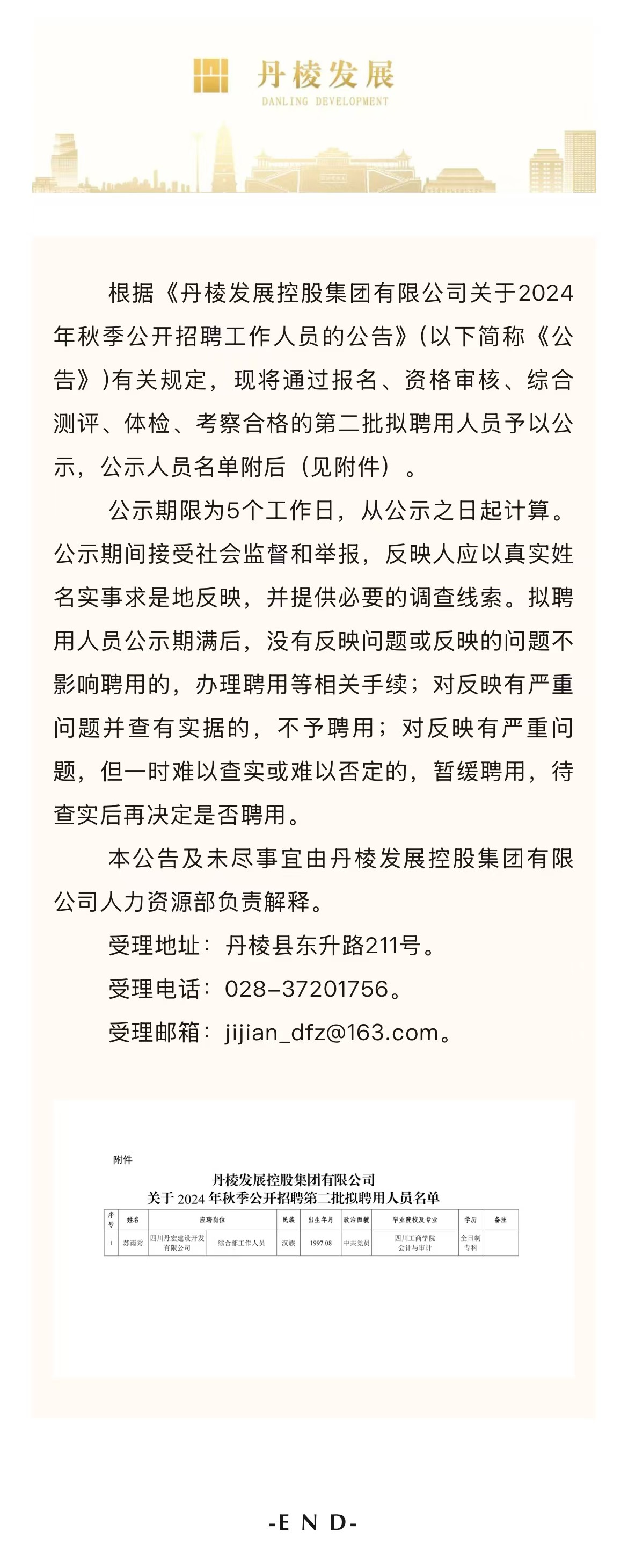 丹棱发展控股集团有限公司关于2024年秋季公开招聘第二批拟聘用人员的公示