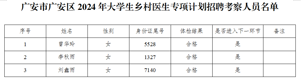 凡参加了广安市广安区2024年大学生乡村医生专项计划招聘体检且合格的人员,列为考察人员。列为考察的人员共3人,名单详见附件。