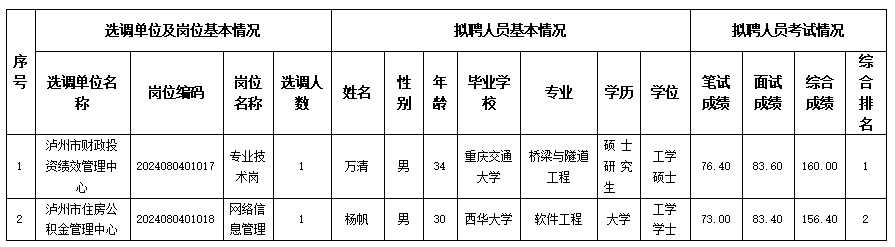根据《关于2024年泸州市市属事业单位第二次公开选调工作人员的公告》,经过笔试、面试、考察和体检程序,我局下属事业单位泸州市财政投资绩效管理中心拟占编聘用万清同志、泸州市住房公积金管理中心拟占编聘用杨帆同志。现向社会公示五个工作日,公示时间从2024年12月12日至2024年12月18日。