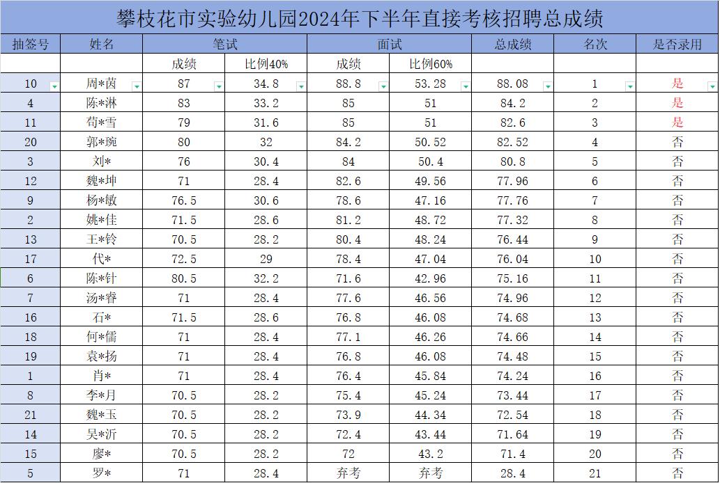 按照攀枝花市委组织部、攀枝花市人力资源和社会保障局及攀枝花市教育和体育局的统一部署和安排,根据《攀枝花市实验幼儿园2024年下半年直接考核招聘教师实施方案》,幼儿园已完成相关考核工作,现将考核结果予以公示,公示日期为2024年12月17-12月19日: