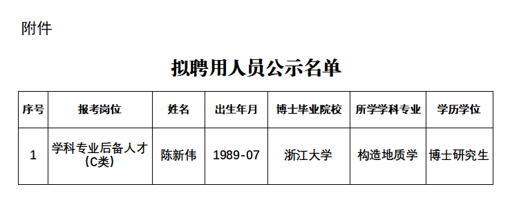 根据《成都理工大学2024年考核招聘高层次人才公告》等有关规定和工作要求,确定陈新伟博士为我校考核招聘高层次人才拟聘用人员,现予以公示(详见附件)。