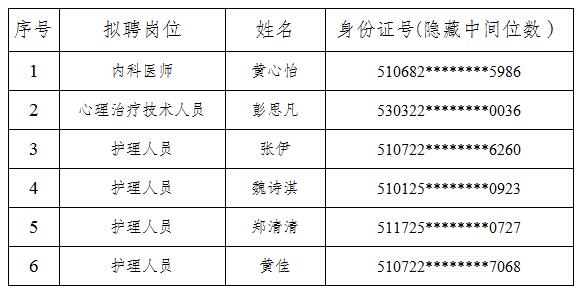 根据2024年11月29日《成都市新都区妇幼保健院编外专业技术人员招聘公告》(〔2024〕2号)规定要求,通过报名、资格审核、笔试、技能考核、面试、体检及公示等环节,以下6人符合岗位条件并被录用,请于2025年1月6日,到我院九楼人事科报到。