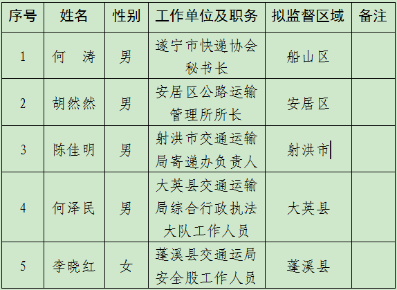 根据2024年12月24日《关于聘请遂宁市邮政特邀监督员的公告》要求,经报名、资格审查、面试,现确定下列人员为拟聘用人员并公示如下: