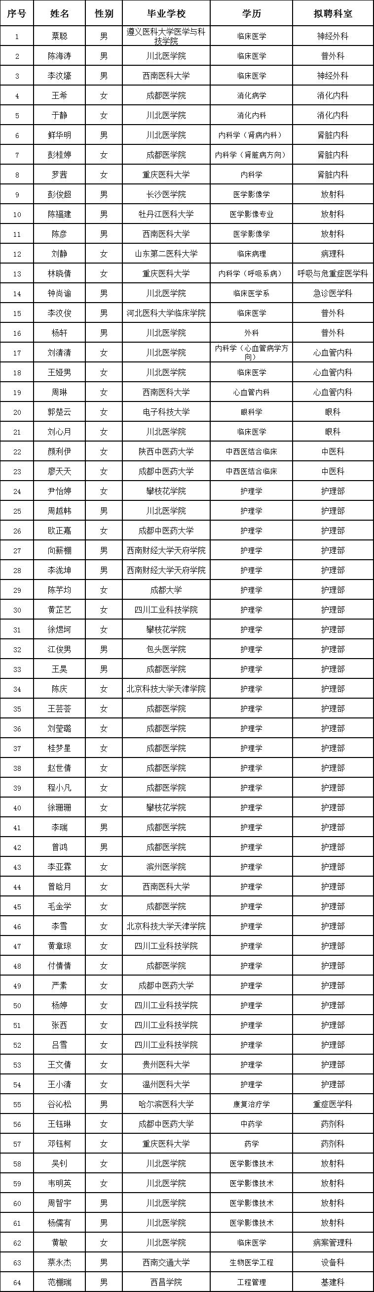以下人员经我院《自主招聘人员聘用管理规定》的相关流程及要求进行招聘测试后,符合相应岗位要求,现予以录取。