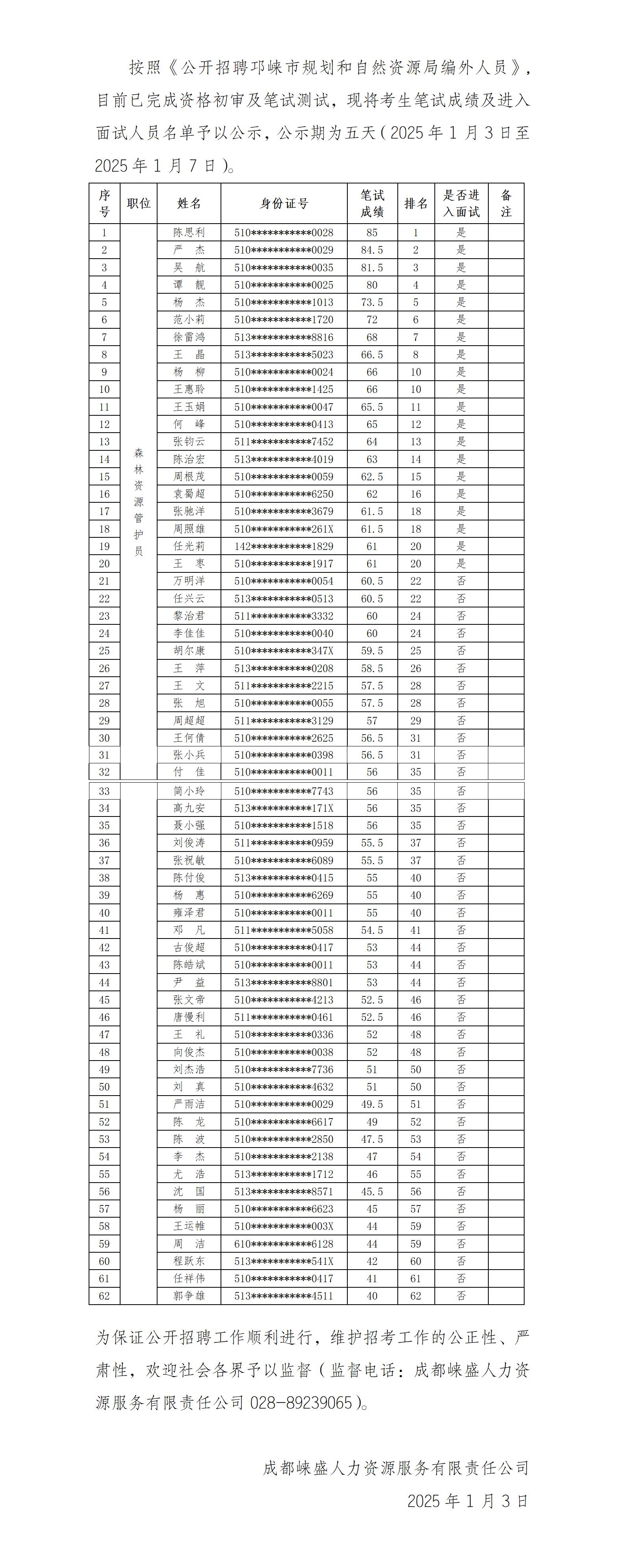 成都崃盛人力资源服务有限责任公司关于公开招聘邛崃市规划和自然资源局编外人员笔试成绩及进入面试人员名单的公告