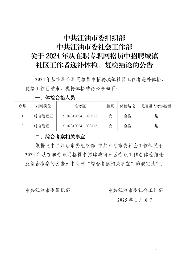 中共江油市委组织部中共江油市委社会工作部关于2024年从在职专职网格员中招聘城镇社区工作者递补体检、复检结论的公告