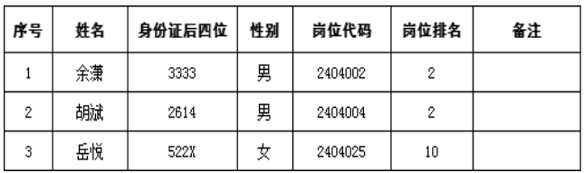 因首批政审考察对象惠涛(岗位编码2404002)、张斌(岗位编码2404004)、陈洁(岗位编码2404025)3人主动放弃政审考察,根据《公告》要求,现将相关空缺岗位递补体检政审考察人员名单公告如下: