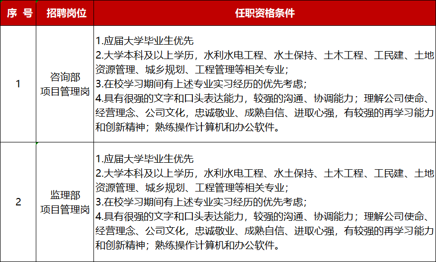 1、咨询部项目管理岗员工1名,监理部项目管理岗员工1名。