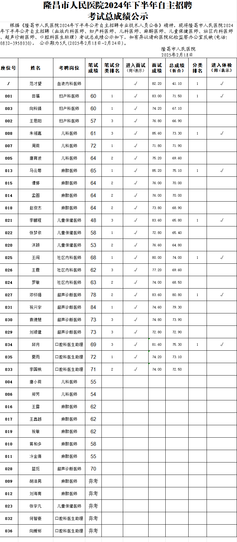 隆昌市人民医院2024年下半年自主招聘考试总成绩公示