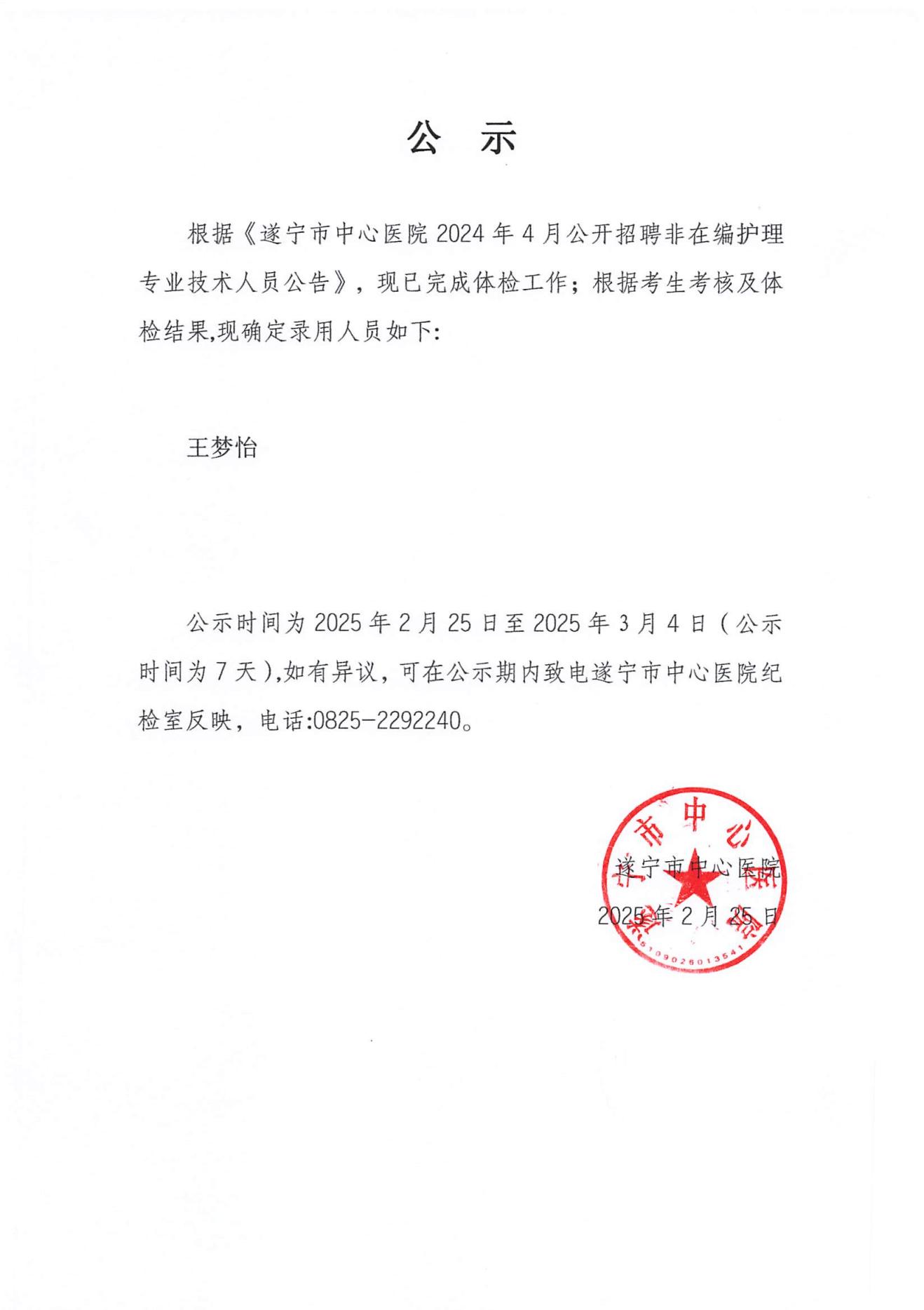 遂宁市中心医院2025年2月公开招聘非在编护理专业技术人员录用名单公示