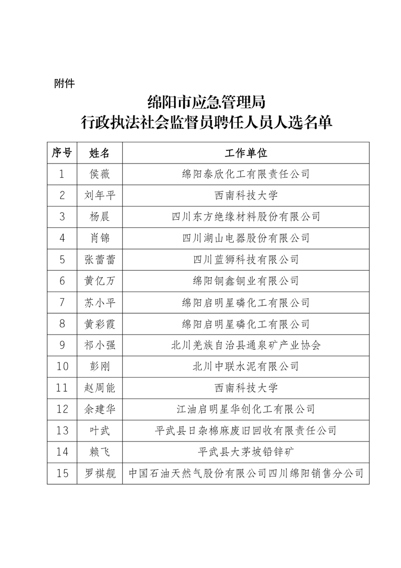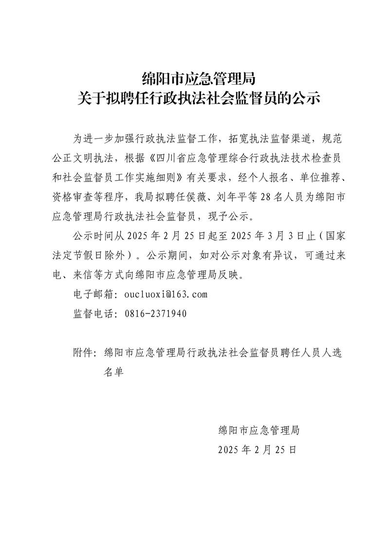 绵阳市应急管理局关于拟聘任行政执法社会监督员的公示