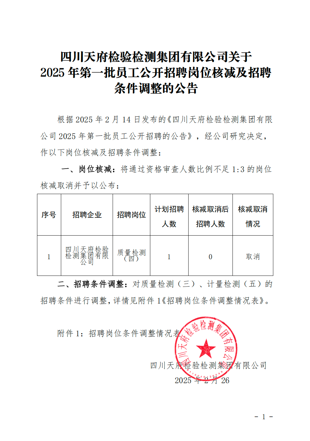 关于四川天府检验检测集团有限公司2025年第一批员工公开招聘岗位核减及招聘条件调整的公告