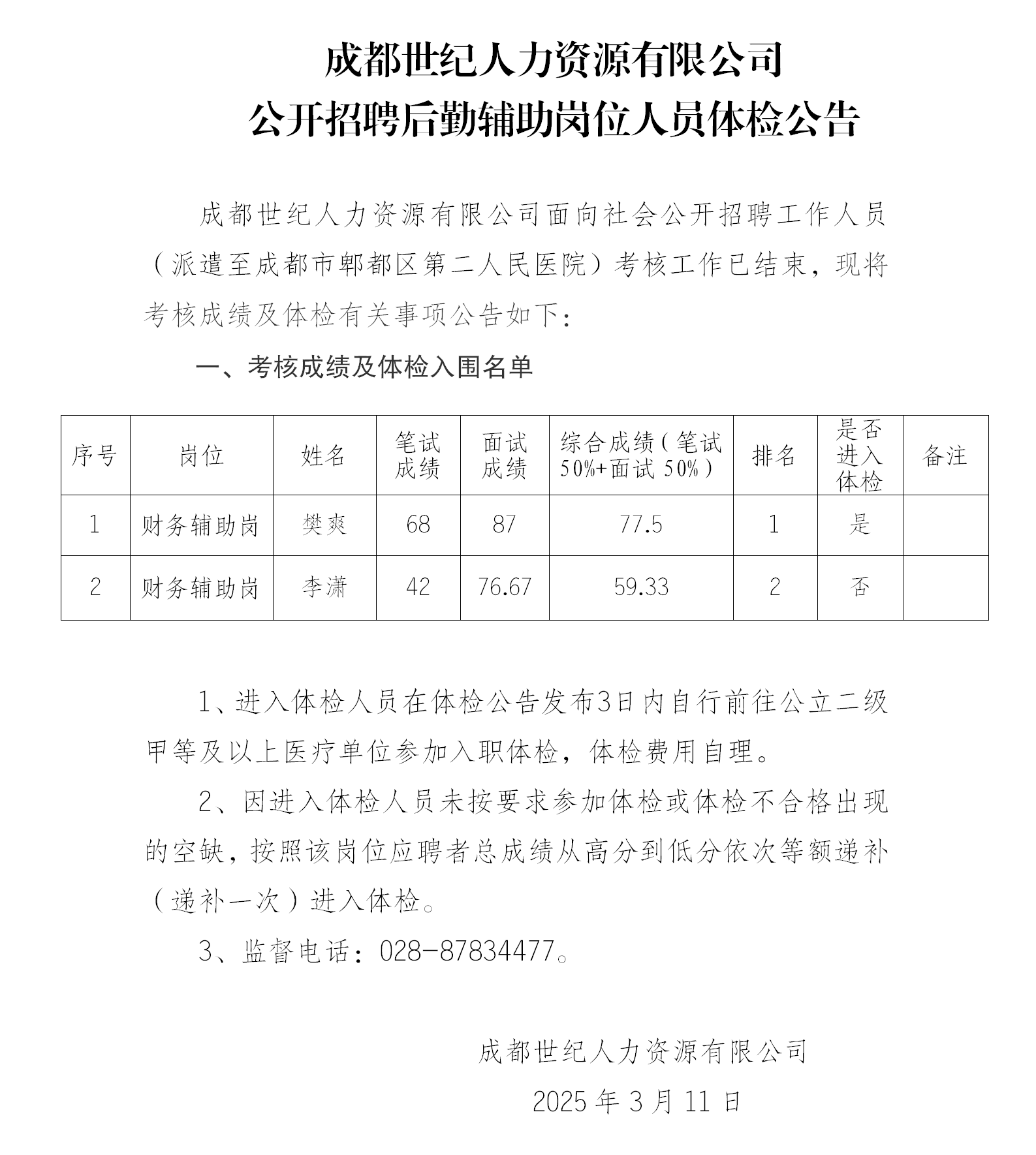 成都世纪人力资源有限公司公开招聘后勤辅助岗位人员体检公告