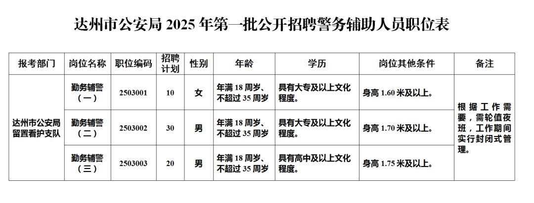 本次公开招聘60名辅警,协助人民警察开展监察留置看护工作。具体的岗位名额、资格条件等详见《达州市公安局2025年第一批公开招聘警务辅助人员职位表》。