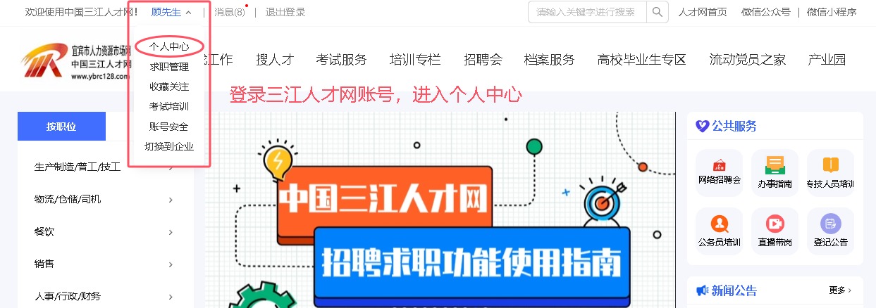 二、登录中国三江人才网账号,进入“个人中心”。