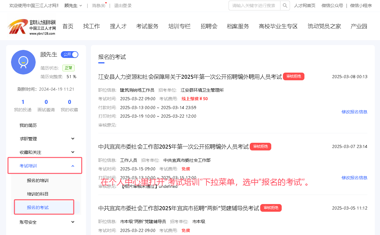 三、在“个人中心”页面打开“考试培训”下拉菜单,选中“报名的考试”选项。