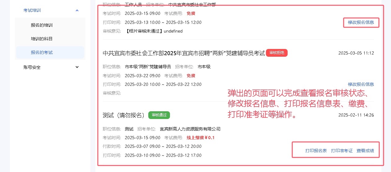 四、根据需要,完成查看报名审核状态、修改报名信息、缴费、打印报名信息表及准考证操作。