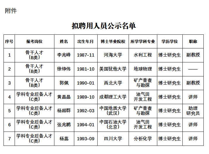 根据《成都理工大学2024年考核招聘高层次人才公告》等有关规定和工作要求,确定李兆峰、徐铮伟、郭佩、黄晶晶、杨超群、张兆鹏和杨蕊博士为我校考核招聘高层次人才拟聘用人员,现予以公示(详见附件)。