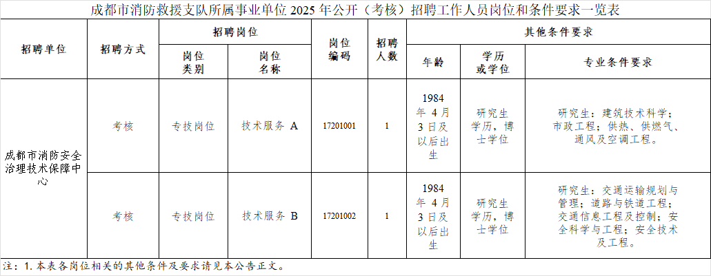 成都市消防救援支队关于所属事业单位 2025年上半年公开(考核)招聘工作人员的公告 因工作需要,根据国家、省公开招聘事业单位工作人员相关规定,按照“公开、平等、竞争、择优”原则,在四川省人社厅统一安排下,成都市消防救援支队面向社会公开招聘工作人员2名,本次公开招聘进入事业单位的为编制内正式工作人员,招聘的工作人员按《事业单位人事管理条例》及相关规定实行事业单位聘用制管理。现将公开招聘有关事项公告如下。 一、 招聘单位基本情况