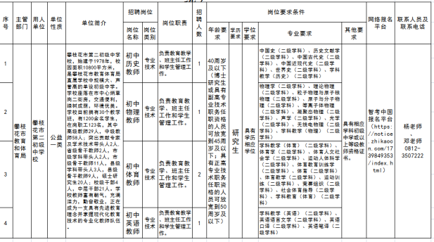 根据《攀枝花市人力资源和社会保障局中共攀枝花市委组织部中共攀枝花市委机构编制委员会办公室关于申报2025年春招引才岗位需求的通知》要求,及面向社会发布《中共攀枝花市委组织部攀枝花市人力资源和社会保障局关于攀枝花市2025年春季人才引进公告》(注:公告可在攀西人才网http://www.pxrc.com.cn/查询),攀枝花市第二初级中学校(简称:攀枝花市二中)拟在2025年上半年招才引智,直接考核招聘5名教师,现将考核招聘时间、地点、方式等安排公告如下: