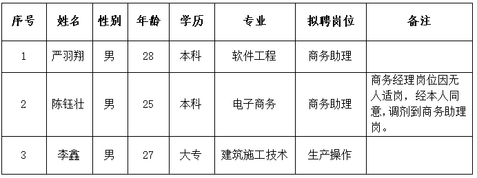 根据《泸州市国有资产监督管理委员会关于市属国有企业委托人才服务中心发布公告的通知》(泸国资委发〔2021〕111号)和《成都天顺保利新材料有限责任公司招聘公告》(2025年3月13日),我公司严格按照招聘程序开展招聘工作,现拟录用以下人员为成都天顺保利新材料有限责任公司员工,予以公示,并就有关事项通告如下: