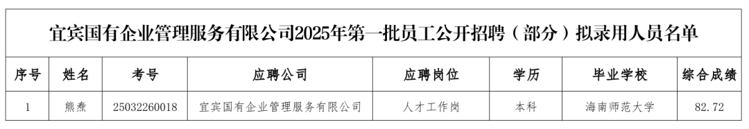 宜宾国有企业管理服务有限公司2025年第一批员工公开招聘(部分)拟录用人员名单