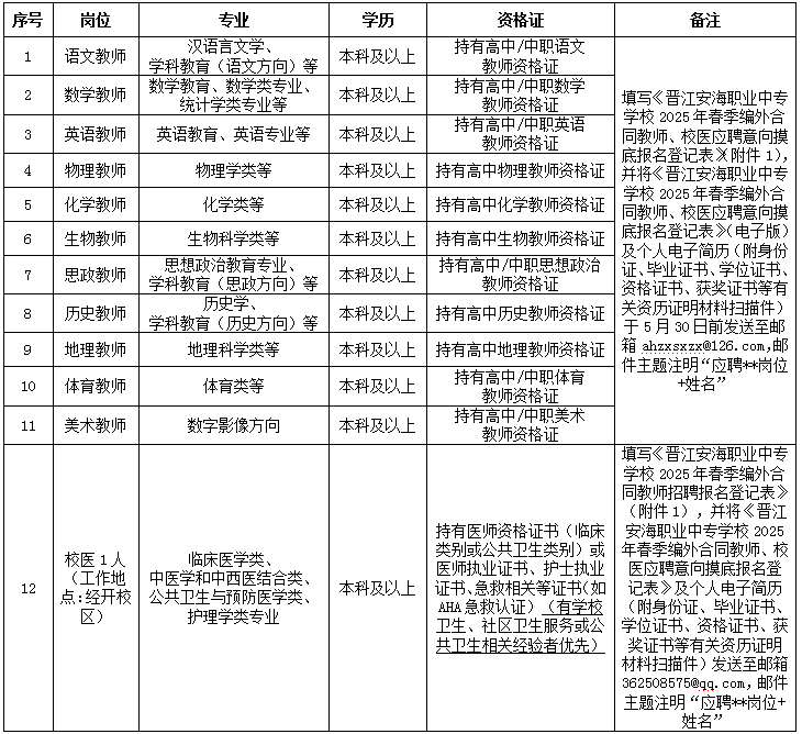 晋江安海职业中专学校是公办省级重点中等职业学校、福建省中职改革发展示范校、首批全国职业院校数字校园实验校、福建省示范性现代中职学校、福建省“双高计划”立项建设A类单位。为进一步优化师资队伍结构,满足学校发展要求,学校拟就2025年秋季部分需求岗位进行意向摸底。现将有关事项通告如下: