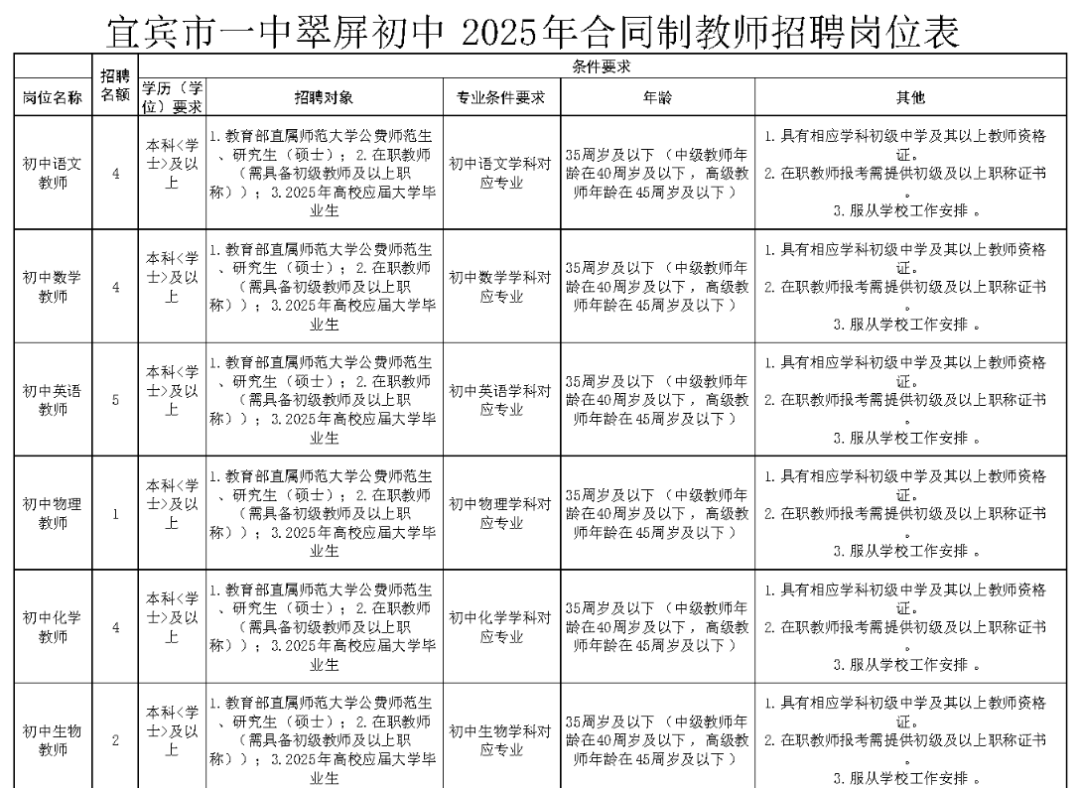 注:年龄计算截止日期为此次招聘报名的最后一日。(例:“年龄:35周岁及以下”,指截止此次报名最后一日未满36周岁,以此类推)。宜宾市一中官网:http://www.ybsyz.cn/。
