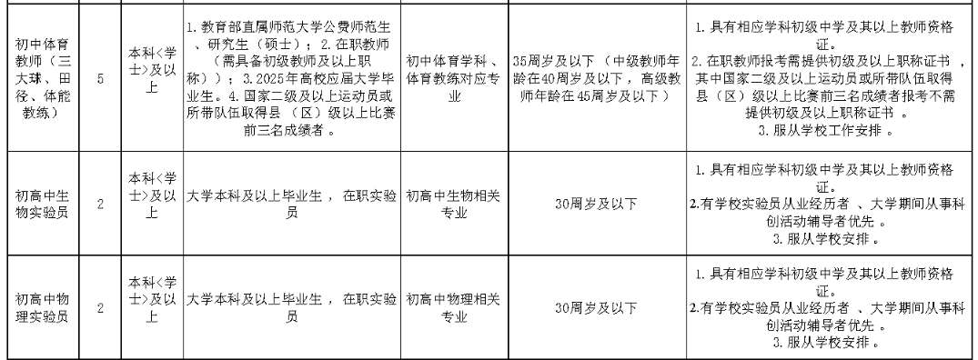 学科教师:初中语文教师4名,初中数学教师4名,初中英语教师5名,初中物理教师1名,初中化学教师4名,初中生物教师2名,初中体育教师(三大球、田径、体能教练)5名。