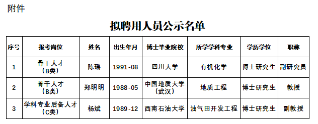 根据《成都理工大学2024年考核招聘高层次人才公告》等有关规定和工作要求,确定陈瑶、郑明明和杨斌博士为我校考核招聘高层次人才拟聘用人员,现予以公示(详见附件)。