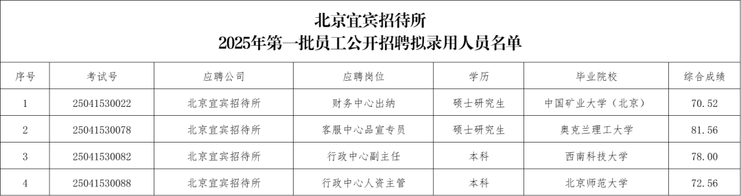 标签: 北京宜宾招待所 2025年招聘 员工录用名单 公示 招聘考试