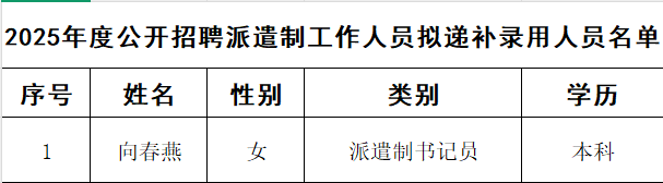 因派遣制工作人员出现人员空缺,根据《宣汉县人民法院2025年公开招聘派遣制工作人员的公告》要求,对向春燕同志进行递补,经笔试、技能测试、面试、体检和考察,现对拟递补录用人员予以公示,公示期为5个工作日。公示期间,社会公众对拟聘用人员有异议的,可通过电话、信件等方式向宣汉县人民法院政治部反映。举报要有事实依据和证据材料,以方便核查,并留下联系方式。地址:宣汉县人民法院政治部电话:0818—5217875