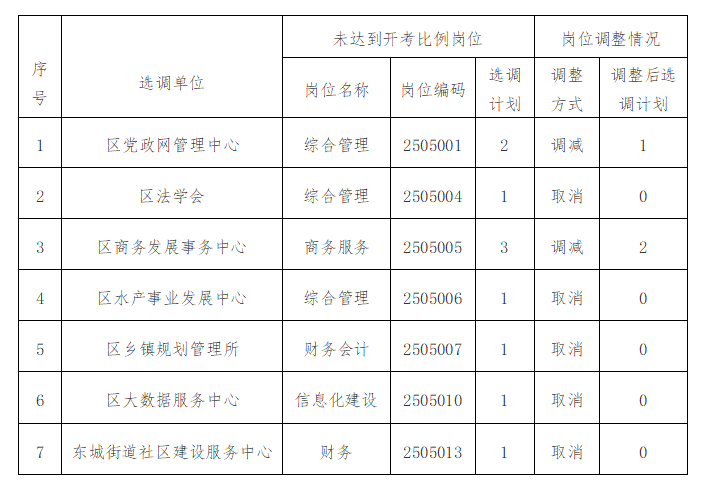 根据《巴中市巴州区2025年事业单位公开考调工作人员的公告》规定,现将未达到开考比例的岗位,取消或调减情况予以公示,被取消岗位的报考人员不调剂。