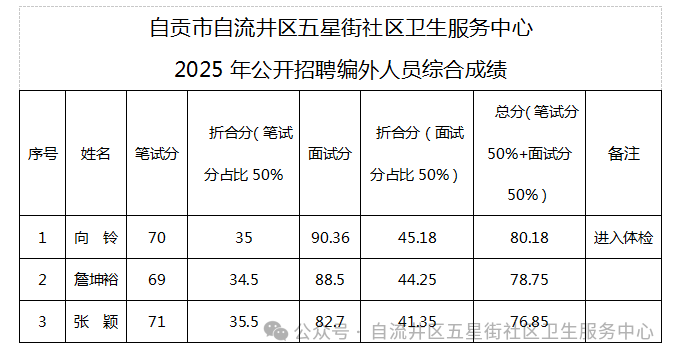 根据《自五社卫发[2019]22号自流井区五星街社区卫生服务中心编外人员管理暂行办法》规定,现将自贡市自流井区五星街社区卫生服务中心2025年公开招聘编外人员综合成绩和进入体检人员名单予以公告。