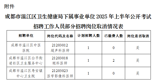 根据《成都市温江区卫生健康局关于下属事业单位2025年上半年公开考试招聘工作人员的公告》要求,经研究,决定取消成都市温江区中医医院、成都市温江区公平街道社区卫生服务中心、成都市温江区寿安镇中心卫生院3家事业单位的3个招聘岗位,现将相关事项公告如下。