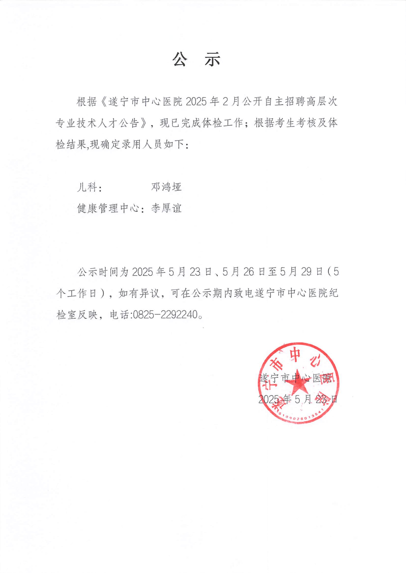 遂宁市中心医院2025年2月公开招聘高层次专业技术人员录用名单公示