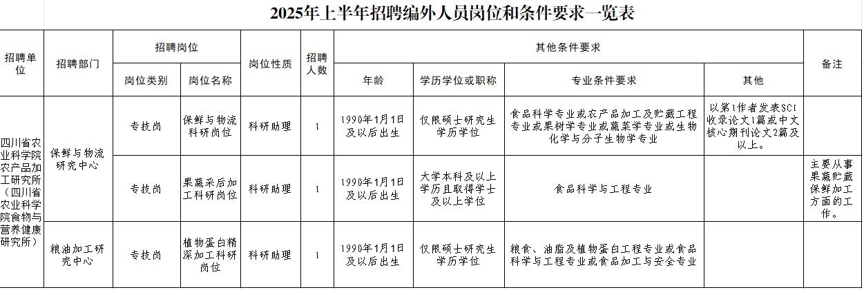 四川省农业科学院农产品加工研究所(四川省农业科学院食物与营养健康研究所)从事农产品贮运保鲜与品质调控、食物营养与健康功效、食品微生物与发酵工程,以及新资源食品、食品生物制造、加工质量安全等研究;开展农产品加工关键技术、食品智能制造及配套设备研发;开展成果转化、产品评价、咨询、规划、培训等服务。因工作需要,拟面向社会公开招聘编外人员(科研助理)3名。现将有关事项公告如下。