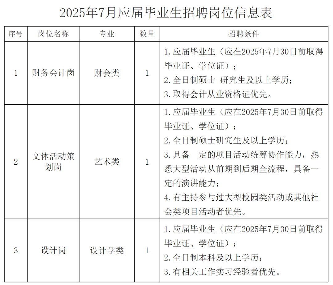 本次招聘财务会计岗、文体活动策划岗、设计岗3类岗位,各类岗位招聘数详见公告附表,实际录用人数由咨询监理公司根据应聘人员数量、综合素质、岗位需求等情况综合研判后统筹调剂录用。